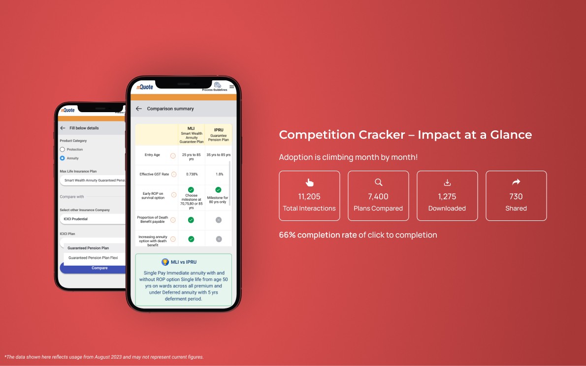 As part of the mQuote app, I designed a new feature called Competition Cracker. This feature helps agents compare insurance products from other companies across key parameters like benefits, premiums, and coverage, so they can confidently offer the most suitable solutions to customers.