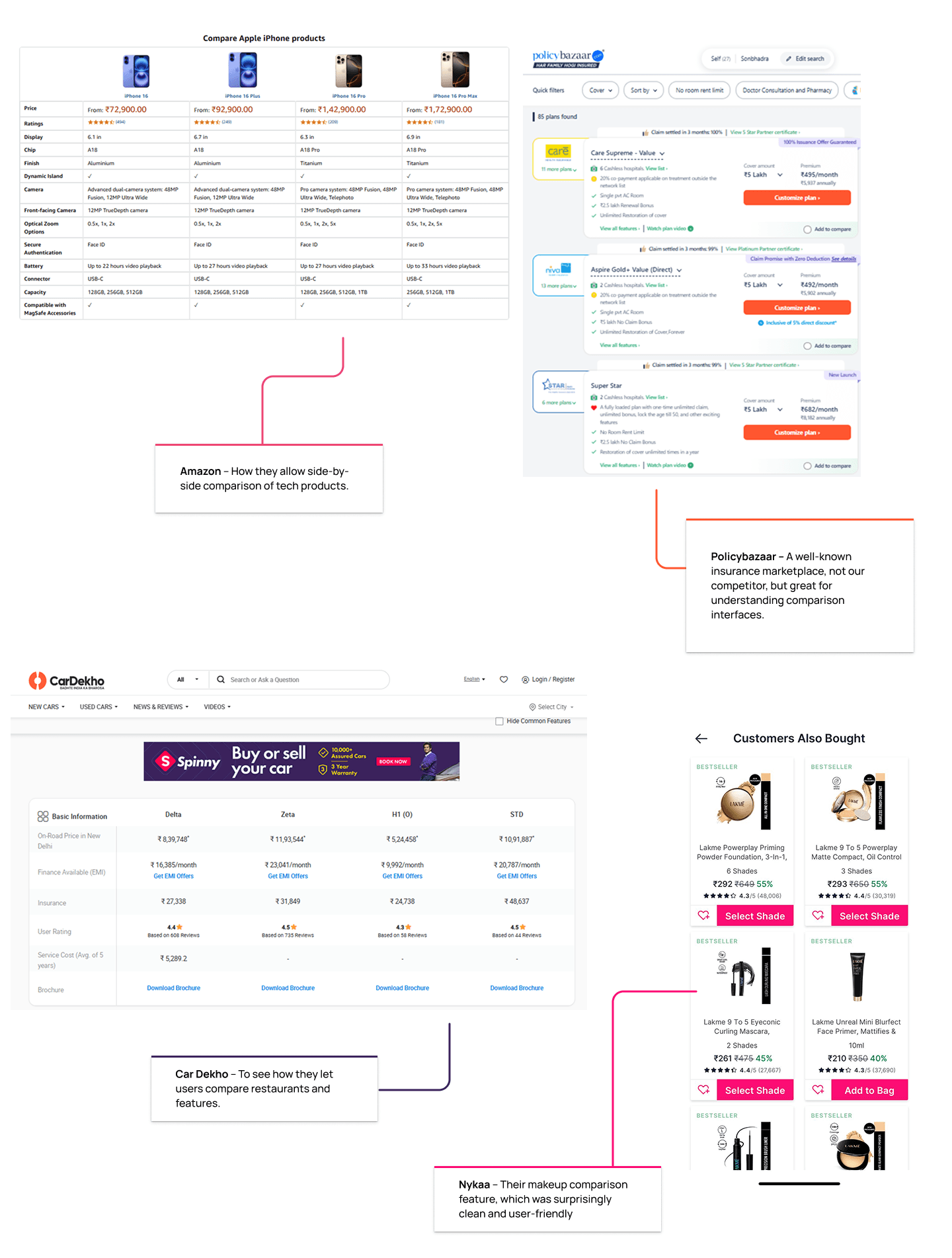 With this in mind, I began by exploring apps that offer product comparison features, even though they weren't directly related to insurance. I wasn’t just looking for what our competitors were doing—I was interested in how different industries handled product comparisons.My goal was to understand how they structured data, presented visual comparisons, and guided users through decision-making.