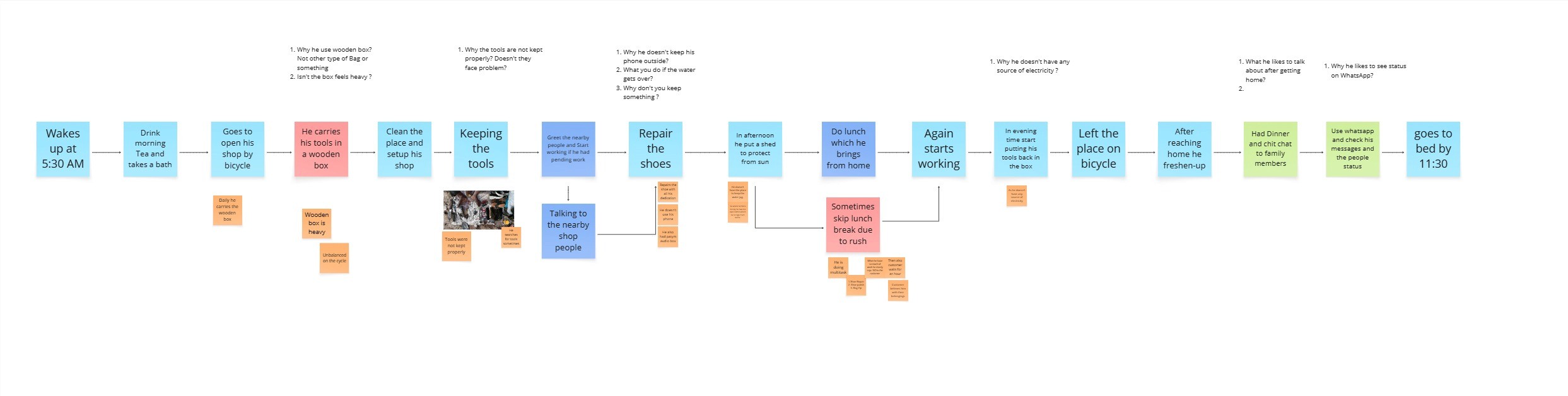 To truly understand the cobbler’s daily challenges, I followed a DILO (Day in the Life Of) approach. I spent a full day with him — observing, listening, and asking questions. From opening his shop in the morning to handling the evening rush, I watched how he managed repairs, tracked orders, and handled walk-ins