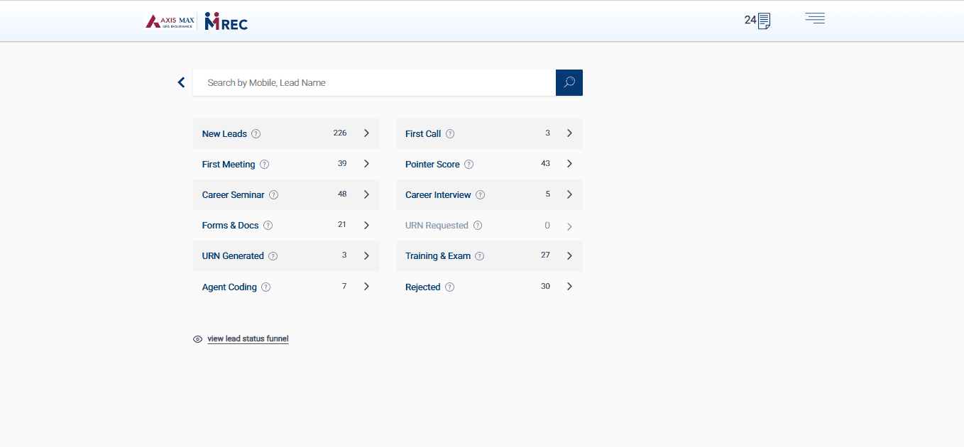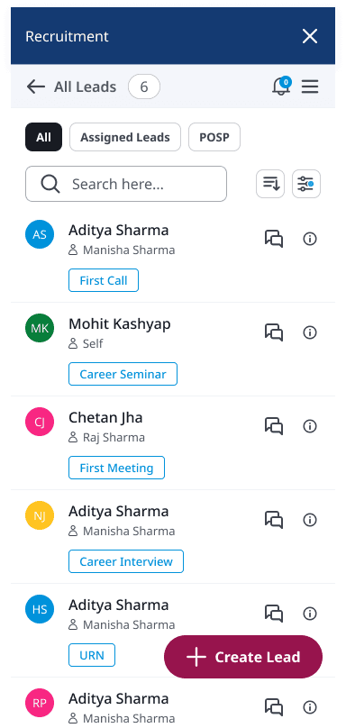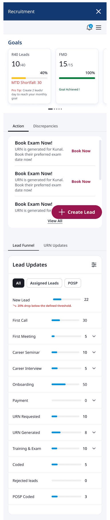 Introduced a persistent navigation model showing recruiters exactly where each lead sits in the journey — lead intake, document collection, eligibility check, training, URN generation. Every screen has a clear next action. Context-switching confusion is eliminated
